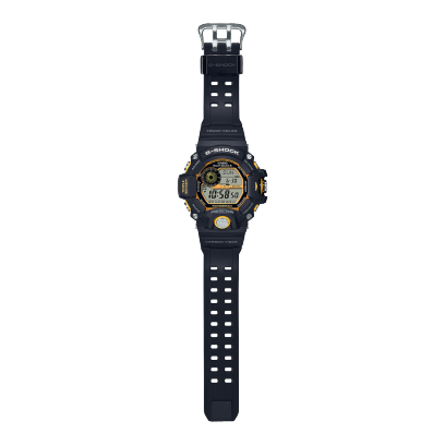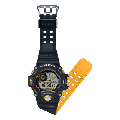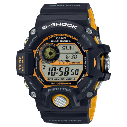 G-SHOCK MASTER OF Gシリーズから、エマージェンシーカラーのイエローを差し色にし、力強いデザインに仕上げたカラーモデルです。高度・方位・気圧/温度のトリプルセンサーを搭載。センサーのボタンには、スムーズで正確な操作を可能にする「ボタンガードシリンダー構造」を採用。センサーボタンを押すと直前に使用したセンサーモードをダイレクトに表示する機能や3段階の報知音を搭載し、感覚的な操作を可能にしています。更にカーボンファイバーインサートバンドや、メタルパーツをボタンやサイドビス、遊環に採用。極限の環境下での活動に必要な機能を搭載したG-SHOCK「レンジマン」です。