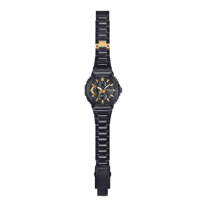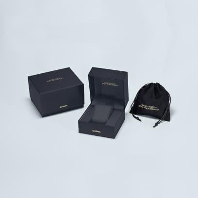 カシオウオッチ50周年記念モデルです。テーマは「0から1を生み出すものづくりの精神」。新たな価値を生む「はじまりの灯火」をイメージし、黒とゴールドで表現したG-SHOCKフルメタルクロノグラフです。カシオの「0から1」を生み出すものづくりの精神を表現した黒とゴールドは、暗闇に輝く灯火をイメージしており、黒色イオンプレーティング処理を施したバンドの中で、一駒だけゴールドカラーにし、さらに「50th ANNIVERSARY」をレーザー刻印しています。ダイアル外周部はカシオのものづくりの精神を表現した「0」「1」をプリントした特別なデザインです。ねじロック式のりゅうずは、ベゼルと同じ八角形状にデザイン。耐衝撃性能をそのままに小型化にも貢献しています。さらに高密度実装技術によりスリムで高機能なモジュールを搭載することで薄型化を実現。着け心地の良さにもこだわりました。Bluetooth®通信により専用アプリと接続し、時刻情報を取得し正確な時を刻みます。タフソーラー、高輝度なLEDライトなど実用的な機能も備えています。