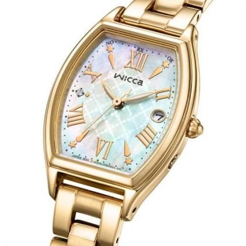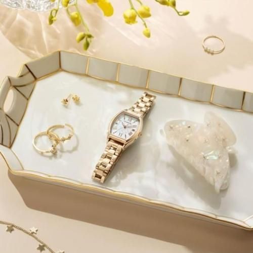 「inner star」をテーマにしたベーシックなトノー型電波時計より、華やかな白蝶貝文字板を採用した限定モデルが登場。デザインテーマである「inner star」には、「自分の中にスターを持つことで自信を持ち、前に進めますように」という想いを込めています。文字板中央に小さな幾何学形状を組み合わせたチェックのパターンを描き、繊細なきらめきを表現。1、5、7、11時位置に中央からはじけるような形状のインデックスを配置し、軽やかさを演出しています。