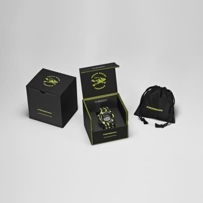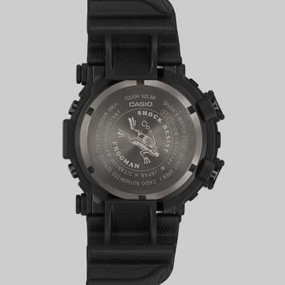 南アメリカの熱帯雨林に生息する“ミスジヤドクガエル*”をモチーフにデザインした、ISO規格200m潜水用防水機能を持つ本格ダイバーズウオッチFROGMANです。ブラックベースに大胆な蛍光グリーンの縦縞模様を施し、ミスジヤドクガエルの強力な毒性を象徴する鮮やかでタフなデザインに仕上げました。でこぼこの皮膚の質感はバンドとベゼルへのスプレー塗装で再現。さらに、ケース裏のカエルのキャラクター刻印もミスジヤドクガエルの縦縞模様を纏った特別仕様に仕上げています。タフソーラーを備え、蛍光灯のわずかな光でも発電し強負荷のかかる各種機能を安定駆動。